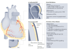 αριστερά Ο ρόλος των περιφερειακών αποθηκών επικαρδιακού λίπους στη στεφανιαία νόσο και την κολπική μαρμαρυγή. Στο σχήμα φαίνονται οι μηχανισμοί που εμπλέκονται: ίνωση, φλεγμονή, ελεύθερα λιπαρά οξέα, αυτόνομο νευρικό σύστημα, ανοσιακή απάντηση, γλυκοτοξικότητα και λιποτοξικότητα.
